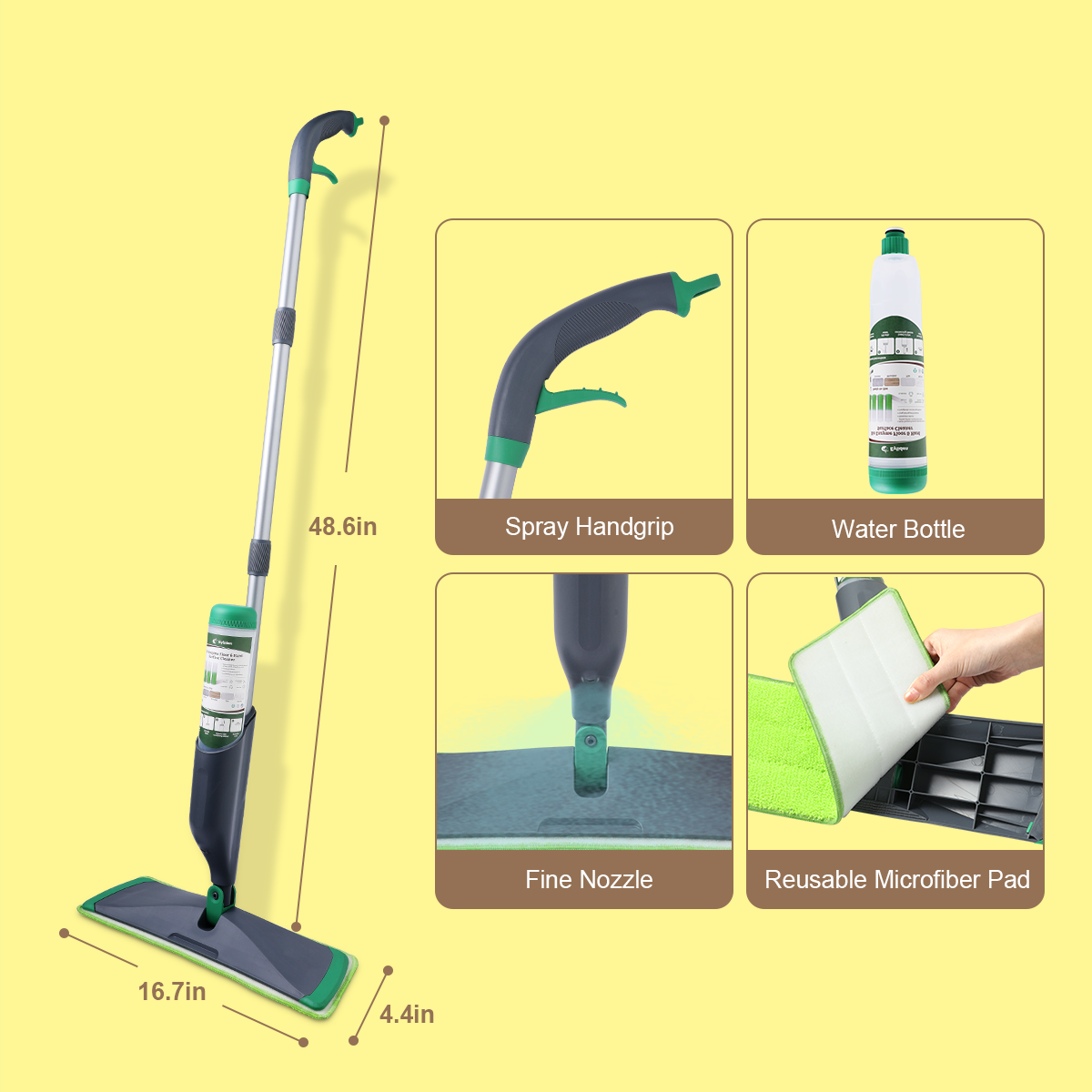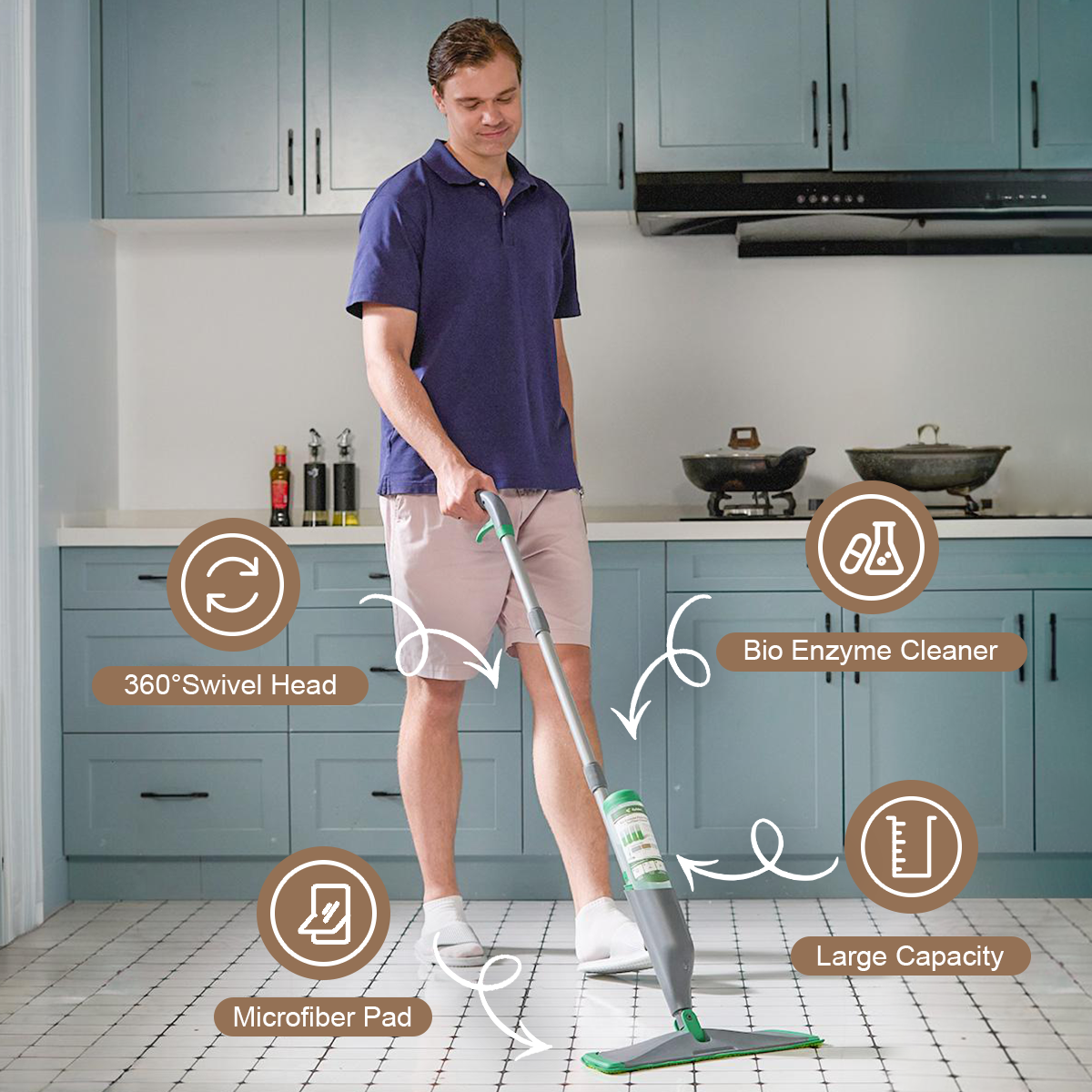 Yocada’s spray mop features a naturally balanced bio enzyme formula that lifts away grease, grime, and food residue on contact.